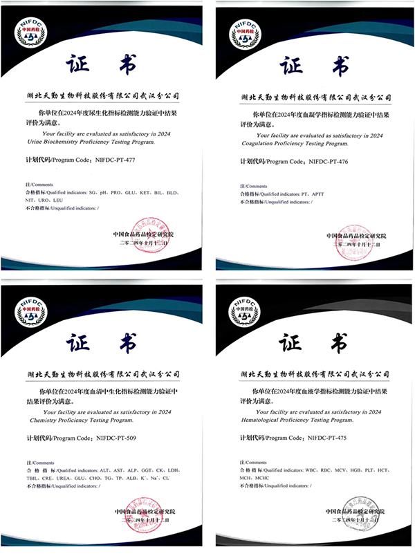 在血清中生化指標(biāo)(NIFDC-PT-509)、血液學(xué)指標(biāo)(NIFDC-PT-475)、血凝學(xué)指標(biāo)(NIFDC-PT-476)和尿生化指標(biāo)(NIFDC-PT-477)四個關(guān)鍵項目的能力驗證過程中,天勤生物武漢分公司提交了全部37個能力驗證指標(biāo),且所有項目均以滿分100分通過,最終獲得“滿意”的最高等級認(rèn)定。在臨床檢驗領(lǐng)域,天勤生物武漢公司不僅配備了先進(jìn)的儀器設(shè)備,還建立了完善的實驗室質(zhì)量控制體系,并擁有一支高技能的專業(yè)團隊,這一系列優(yōu)異的成績充分展示了天勤生物武漢分公司在臨床檢驗領(lǐng)域的扎實功底。