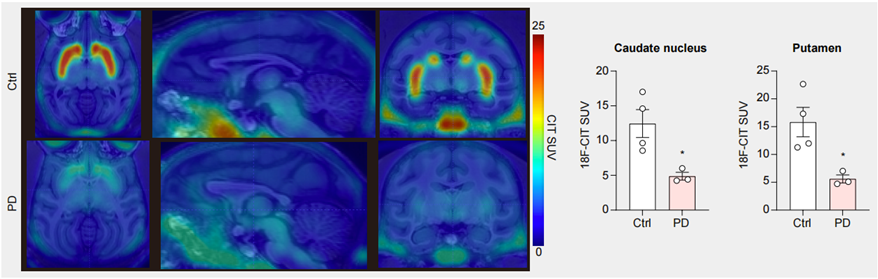 ● 分子影像數據展示造模后,動物腦內多巴胺神經元損傷;