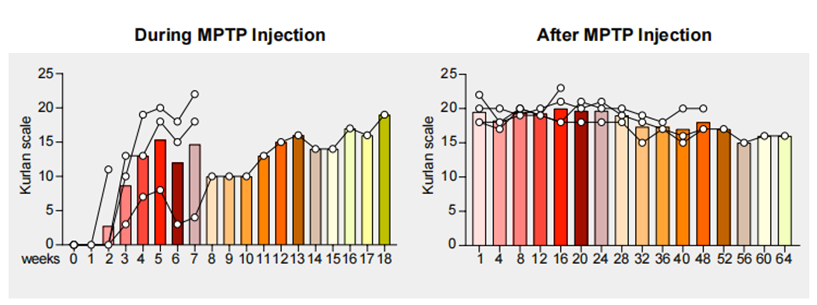 圖1. Kurlan評分顯示模型動物PD樣行為學癥狀出現迅速(左)。且造模后癥狀穩定,持久(右)